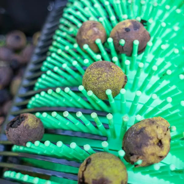 Cette récolteuse est conçue pour ramasser les noix noires de 3,81 à 5,08 cm de diamètre.